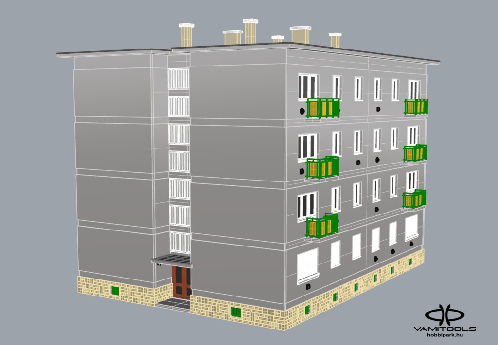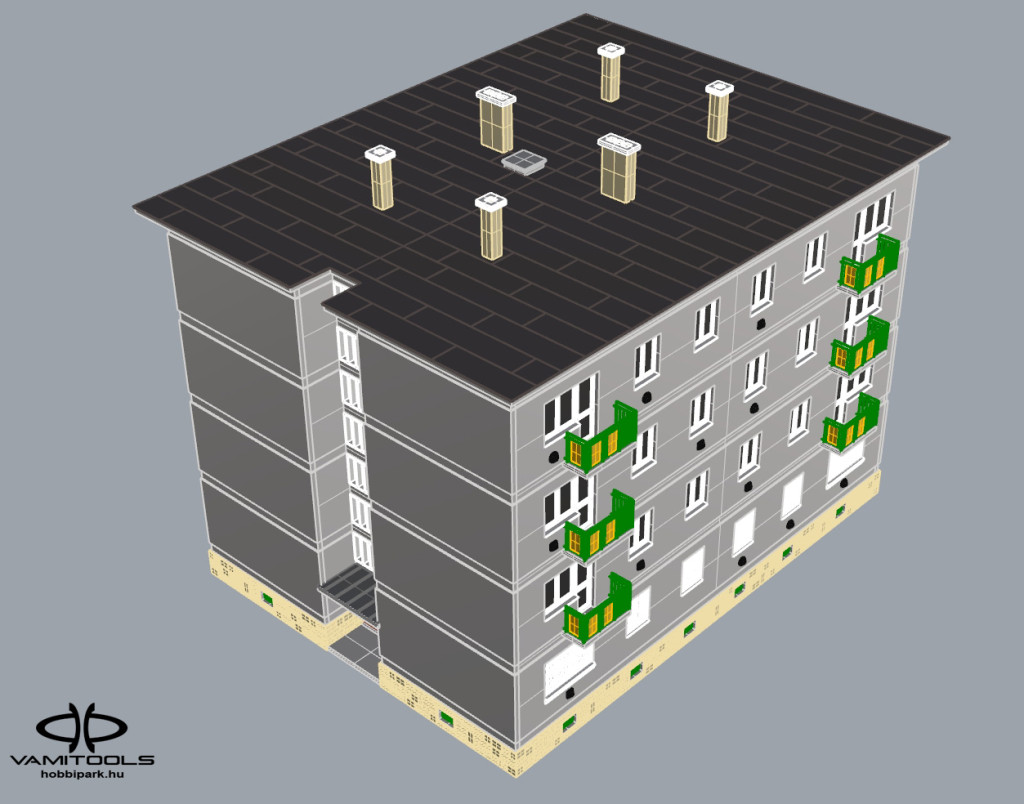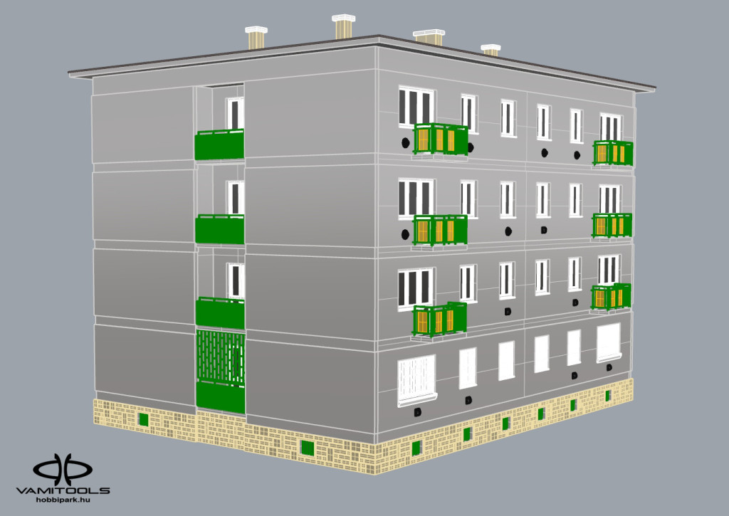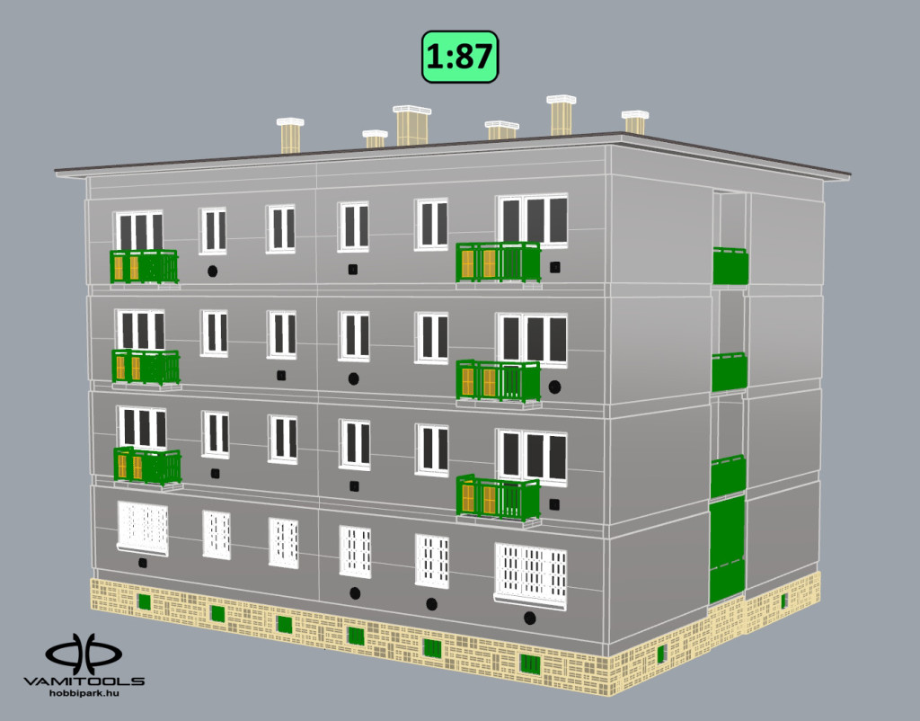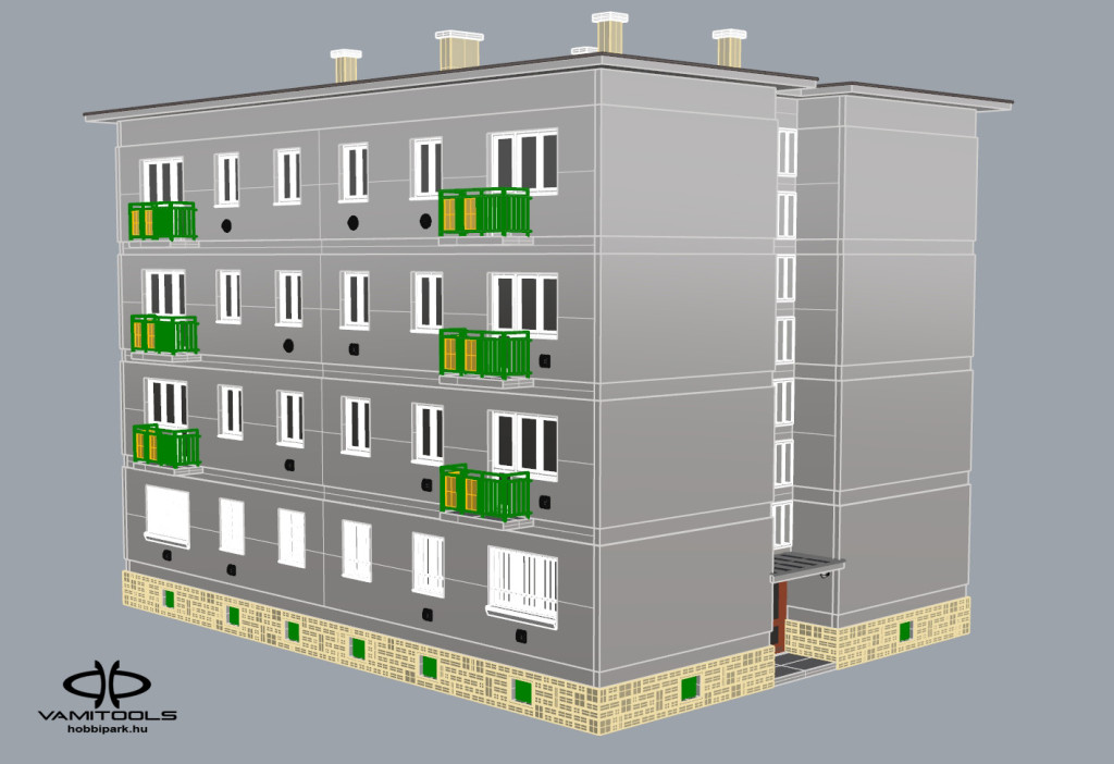 Apartment house. The walls of the building are made from water clear plexiglass (unpainted). There are some pictures where the plexiglass parts are shown by cyan color. There parts are needed painting.